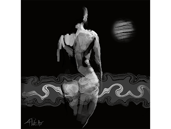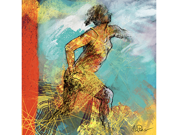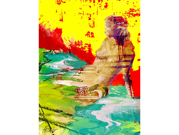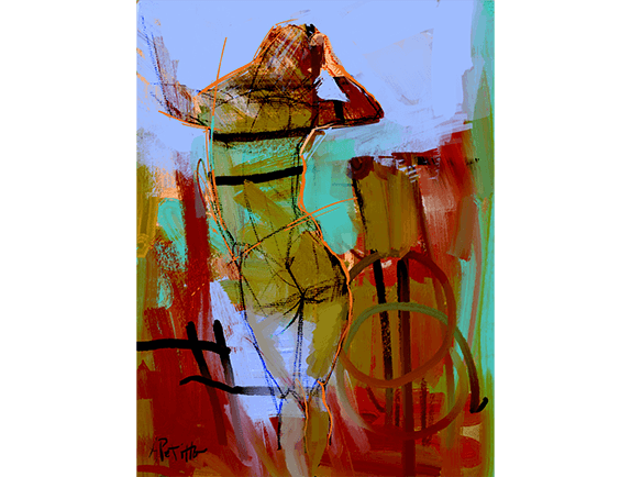 In her latest work, Andrea Petitto incorporates charcoal drawings and vigorous and colorful brush work with digital painting. For decades, Petitto has excelled in developing skill with brushes, sticks, palette knives, and digital applications. Now she is combining these techniques to create new compositions. “Using the unique capabilities of digital painting in conjunction with my own drawing and painting techniques results in a fresh look, an extension of my traditional painting style.” —Andrea Petitto
