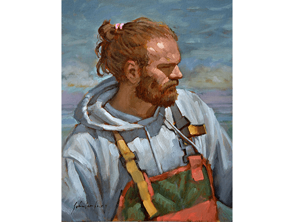 I was initially struck by both the colors and the subject — the orange of the coveralls and blue of the gloves. I admire how Paul paints whites, as in a T-shirt. And the subject: there is no doubt as to the occupation, so much a part of our New England heritage and the Cape that I love so much. The composition tells a story. You can see the look of concentration on his face as they make their final approach. Paul has a talent for showing us beauty in the everyday: clothing on a clothesline blowing in a summer breeze, a young fisherman pulling into port. He makes us look at the ordinary in a new light and through his eyes and his talent, we are enlightened. — Janice Reece